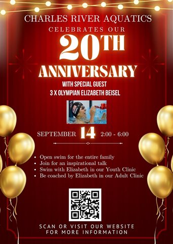 3X Olympian Elizabeth Biesel comes to Charles River Aquatics at Boston Sports Institute in Wellesley on September 14. She will be coaching and swimming with Masters swimmers at a clinic from 2-2:50. Participant are also invited to bring family and stay for an open swim session at the end of the day. Details and registration for the event can be found here