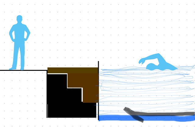 • I’d think that a movable bulkhead would indicate that it’s a competition pool meant for swimming laps (or at least was originally). And consequently wouldn’t have steps across one end. But you are right that the end of the steps  would be right about at the 50m point. Still, I’d think something could be created to set in the water, right at the steps, to function as a temporary wall. But personally, with the pool management’s permission, I think I would try for something inexpensive like this graphic I made.  Tell them it’s for community use, and maybe they’d let you store it right there at the pool. With a few 2x4s and some plywood, I’d make a matching section of steps, with the same dimensions at the steps in the pool, about 3’ or 4’ wide. Then flip it upside down in the pool and the existing steps would hold it in place. Might require a weight to keep it from floating.